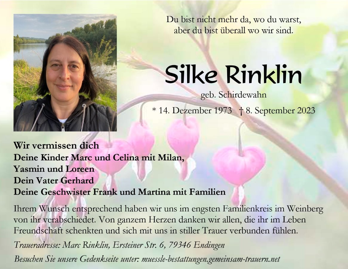 ich habe Silke Rinklin nicht näher gekannt - aber ihre zugewandte, herzliche, verständnisvolle und kompetente Art bei jedem Termin zur Blutabnahme in der Praxis Dr. Krogull hat mich immer bestärkt und mir sehr über schwierige Zeiten weg geholfen! Ich bin sehr bestürzt von der Nachricht über ihren Tod und auch sehr traurig. Sie wird sehr fehlen - aber bestimmt nicht vergessen werden!